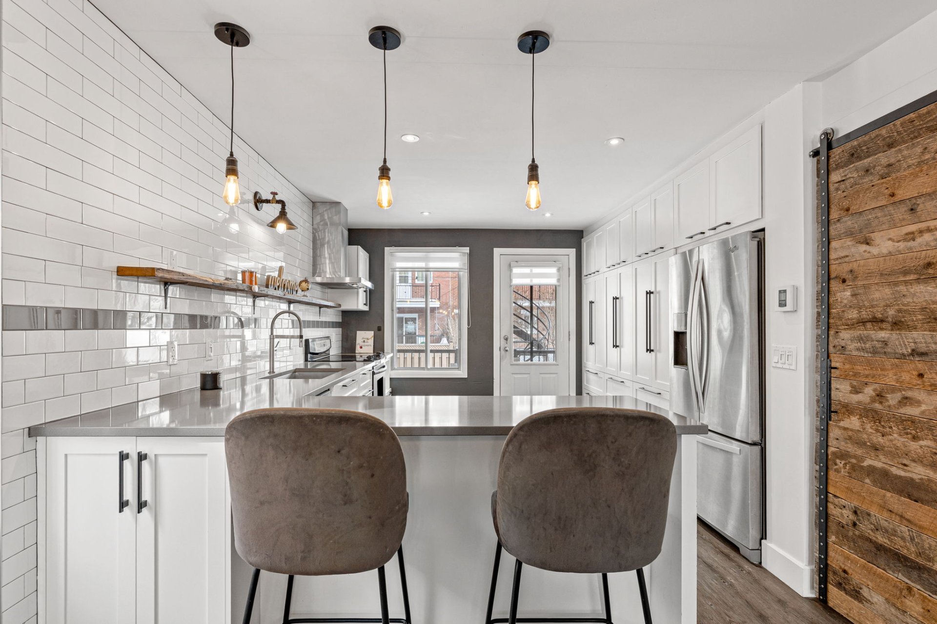Cuisine moderne avec grand comptoir en quartz et abondance